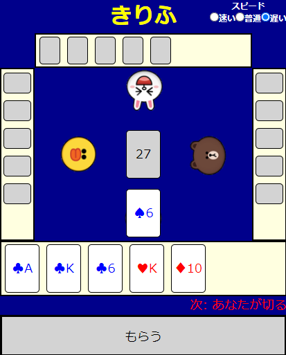 九州で大人気のトランプゲームです。「ババ抜き」のようなメジャーなゲームと違い、この「きりふ」というゲームはわたしの知る限りあらゆるPlatformで探しても存在しないようなので自分で作ってみました。
